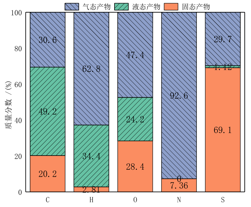 機油的加入對三相產物的元素分布產生了較大的影響。C元素在固態產物中的比例一直降低,從39.6%降低到20.2%,這一方面是由于炭黑的產率一直在降低,另一方面則是炭黑中的C元素含量降低。而裂解油和熱解氣的比例則在提高,這表明隨著機油的加入,C元素整體上從固態產物向裂解油和熱解氣轉移。機油的加入使得熱解炭黑的H元素進一步從6.42%減少到2.81%,裂解油中的H元素則從62.4%降低到34.4%,而熱解氣中的H元素則從31.2%上升到62.8%,這表明隨著機油的加入,H元素主要從裂解油向熱解氣中轉移。O元素并不具有可燃性,但裂解油中的O元素質量分數一直在升高,熱解氣中的O元素先升高后降低到與未添加機油時一致,而熱解炭黑中的O元素則一直從48.7%降低到28.4%,這說明機油加入后,O元素整體上是從熱解炭黑向裂解油中遷移。機油添加后,裂解油中仍然沒有N元素,這對裂解油來說是一個好消息,但熱解氣中的N元素含量明顯上升,從78.8%上升到92.6%,這對熱解氣來說不是一個好消息。這一是由于機油中的N含量本來就比較高,二是由于機油的加入促進了炭黑中N化物的釋放,更多的N化物以氣態氧化物的形式存在于氣態產物中。熱解炭黑中的N元素質量分數則一直在降低,這對熱解炭黑來說也不是一個好消息,因為炭黑中摻雜的N原子可以提高炭黑的吸附性能,炭黑中N元素的質量分數降低則意味著炭黑的吸附性能會大打折扣。機油的加入使得N元素從炭黑中進一步遷移到氣態產物中,但這個方向并不是我們希望看到的。對于S元素而言,三相產物中的S元素分布雖然都有變化但變化幅度較小,整體上看主要是從氣態產物向固態產物中遷移。